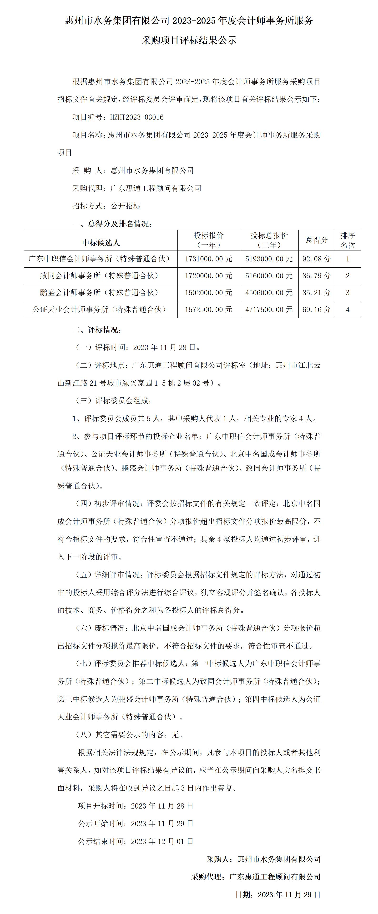 惠州市水務(wù)集團(tuán)有限公司2023-2025年度會(huì)計(jì)師事務(wù)所服務(wù)采購(gòu)項(xiàng)目評(píng)標(biāo)結(jié)果公示