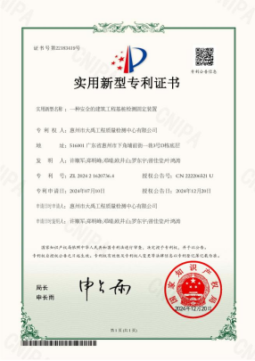 近日,惠州市大禹工程質(zhì)量檢測中心有限公司在科技創(chuàng)新方面再創(chuàng)佳績,獲得了一項名為“安全建筑工程基樁檢測固定裝置”(專利授權(quán)公告號:CN 222206521 U)的實用新型技術(shù)專利,其實用性、創(chuàng)新性和安全性在建筑工程基樁檢測領(lǐng)域具有廣泛的應用前景。這一專利的獲得,不僅為大禹檢測公司帶來了更多的技術(shù)儲備,也為提升建筑工程基樁檢測的安全性和準確性提供了有力保障。