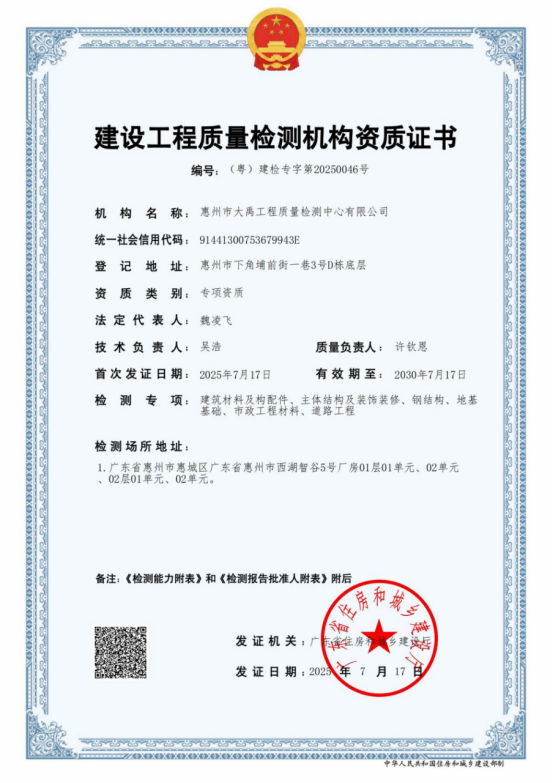 近日,惠州水務(wù)集團(tuán)大禹檢測(cè)公司順利拿下廣東省住房和城鄉(xiāng)建設(shè)廳頒發(fā)的建設(shè)工程質(zhì)量檢測(cè)機(jī)構(gòu)資質(zhì)證書(shū)(編號(hào):(粵)建檢專(zhuān)字第20250046號(hào)),資質(zhì)范圍覆蓋建筑材料及構(gòu)配件、主體結(jié)構(gòu)及裝飾裝修、鋼結(jié)構(gòu)、地基基礎(chǔ)、市政工程材料、道路工程等六大專(zhuān)項(xiàng),突顯大禹檢測(cè)公司在建設(shè)工程質(zhì)量檢測(cè)領(lǐng)域的整體實(shí)力邁上新高度;同步獲惠州市惠城區(qū)住房和城鄉(xiāng)建設(shè)局頒發(fā)的房屋白蟻防治單位登記證書(shū)(編號(hào):02260)。至此,公司成為惠州少數(shù)具備“檢測(cè)+防治”一體化服務(wù)能力的機(jī)構(gòu)。