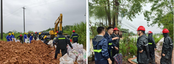 在潼湖崗頭新圍,8月5日早上,水電公司接到赴潼湖崗頭新圍搶險(xiǎn)命令,搶險(xiǎn)隊(duì)70人立即集結(jié)待命,完成應(yīng)急搶險(xiǎn)安全技術(shù)交底工作后乘車前往仲愷高新區(qū)潼湖崗頭新圍開展子堤加高加固搶險(xiǎn)。水電公司總工程師謝武帶隊(duì)趕赴險(xiǎn)情現(xiàn)場(chǎng)勘查,研討搶險(xiǎn)方案,指導(dǎo)搶險(xiǎn)工作。12時(shí)30分,搶險(xiǎn)人員、機(jī)械設(shè)備和搶險(xiǎn)物資已到達(dá)現(xiàn)場(chǎng)第一作業(yè)點(diǎn)開展搶險(xiǎn)。因連日降雨,現(xiàn)場(chǎng)河水水位高漲幾近漫堤,險(xiǎn)情非常緊急。搶險(xiǎn)隊(duì)員或鏟裝沙袋、或搬運(yùn)堆砌、或機(jī)械清障,大家分工協(xié)作,有條不紊開展子堤加高。經(jīng)過(guò)全員不懈努力,僅用4個(gè)小時(shí),第一搶險(xiǎn)點(diǎn)子堤加高加固就已完成,順利完成搶險(xiǎn)任務(wù)。