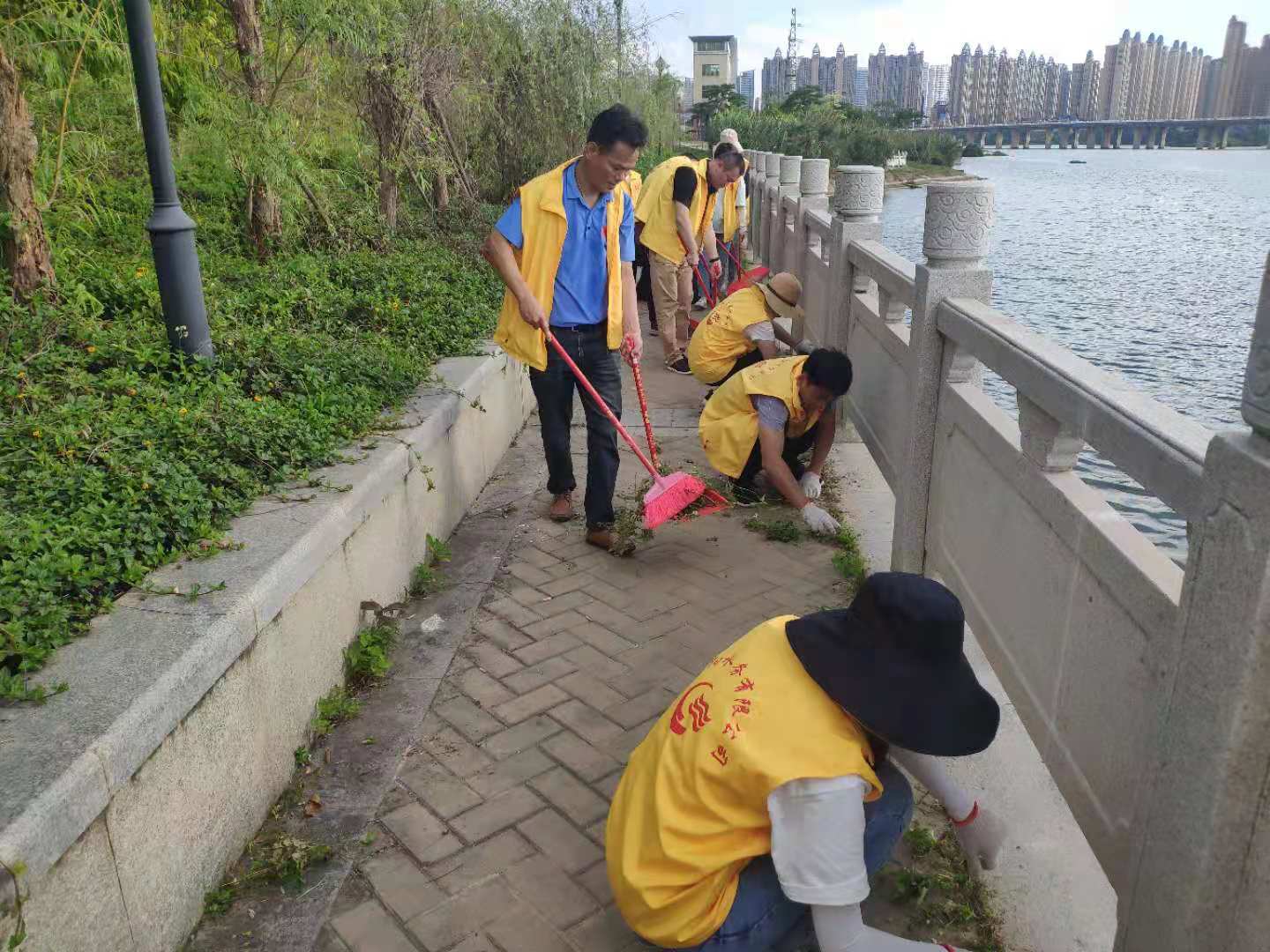 活動(dòng)現(xiàn)場(chǎng),志愿者們頂著炎炎烈日,充分發(fā)揮不怕累、不怕臟的精神,俯身清理磚縫雜草、掃除河道路面垃圾,清除衛(wèi)生死角。經(jīng)過(guò)1個(gè)多小時(shí)的努力,沿河道路變得更加干凈整潔。