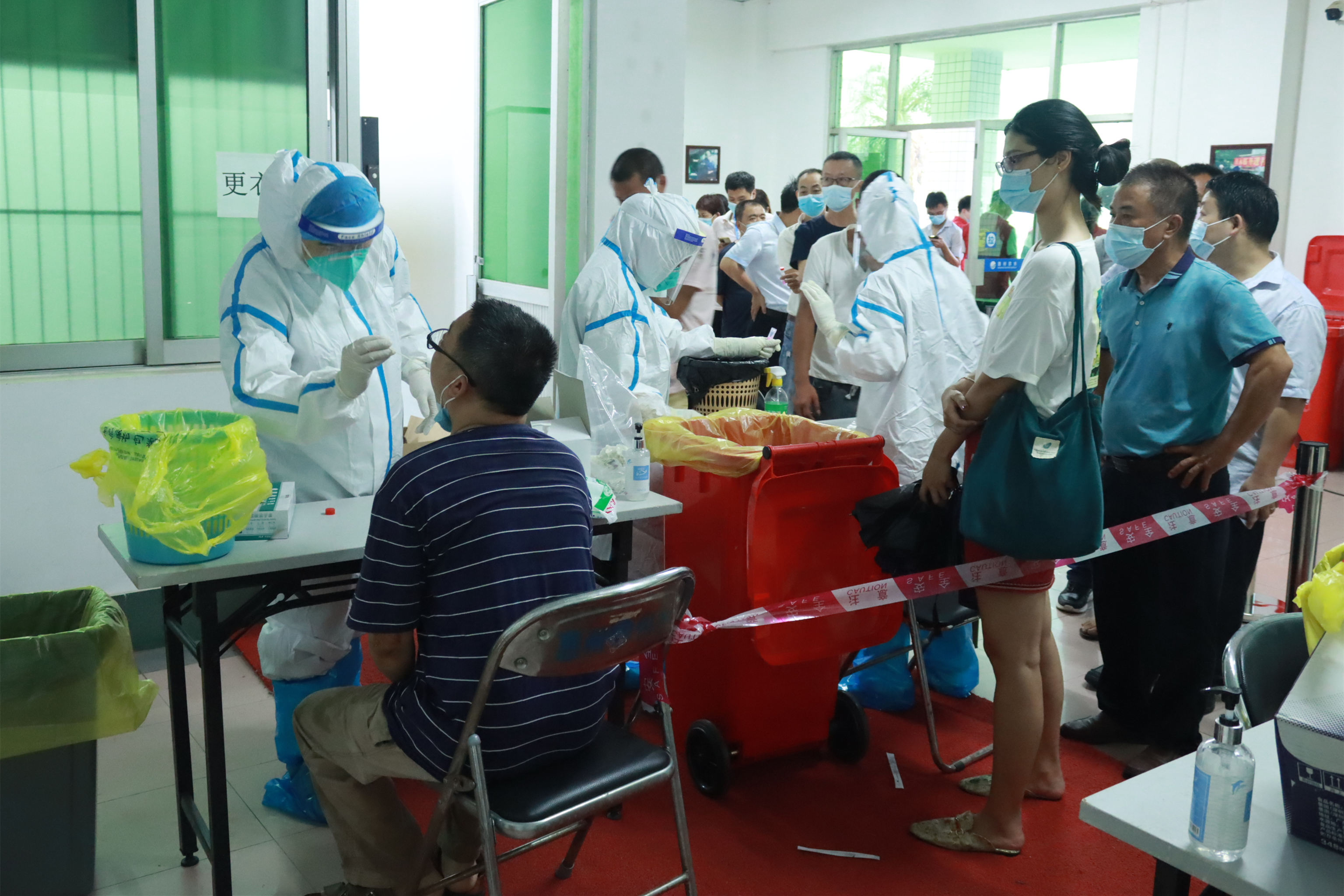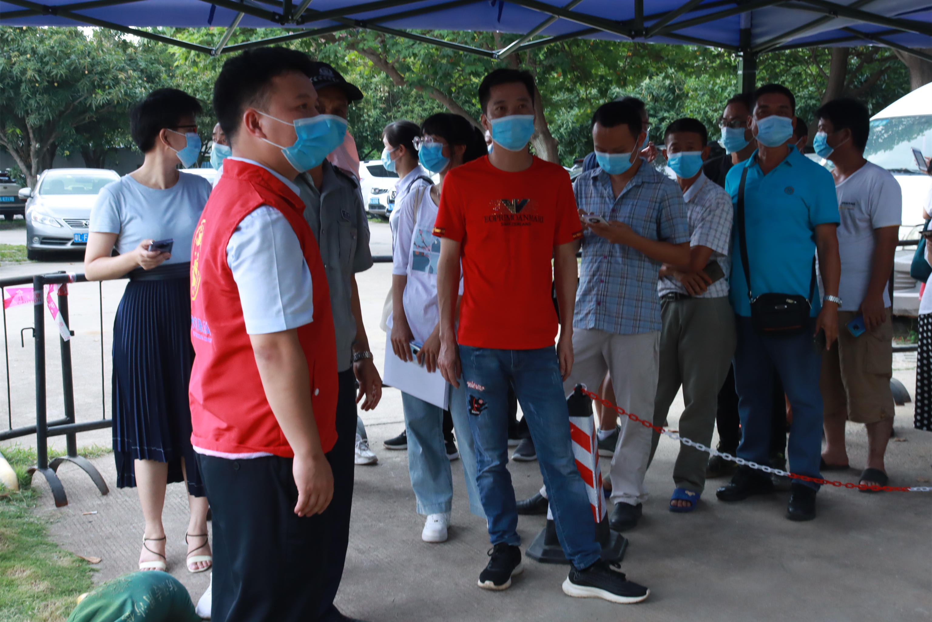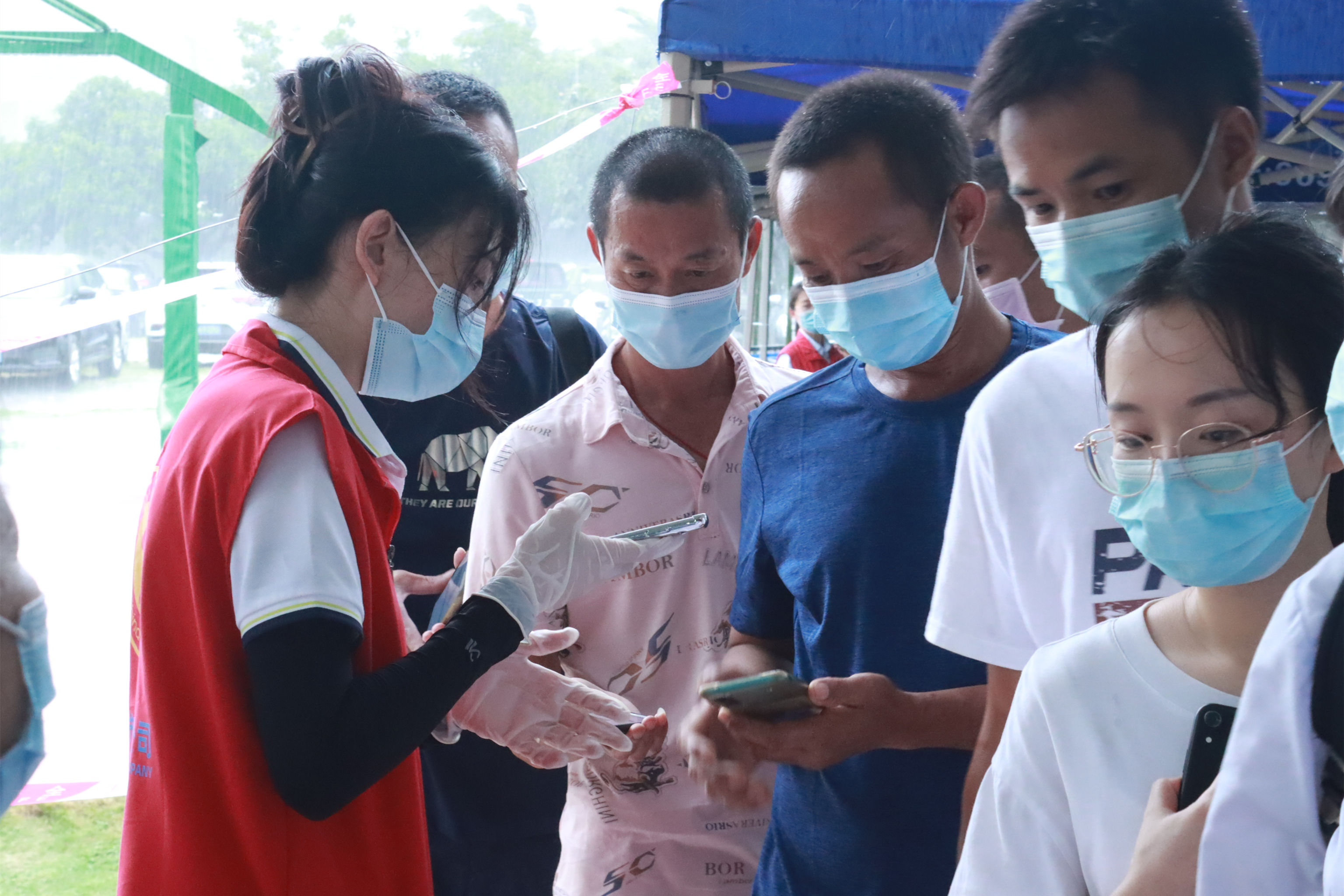 “請(qǐng)等候區(qū)的員工提前出示當(dāng)天的粵康碼、行程卡以及核酸檢測(cè)碼,10人為一組有序進(jìn)行檢測(cè)?!迸抨?duì)等候區(qū),志愿者一遍遍提醒著受檢人員。是日,天氣變化多端,上午異常悶熱,下午又下起了傾盆大雨。志愿者們分信息錄入、現(xiàn)場(chǎng)引導(dǎo)、聯(lián)絡(luò)員以及機(jī)動(dòng)協(xié)調(diào)4個(gè)組,有的負(fù)責(zé)聯(lián)絡(luò)各受檢單位,有的對(duì)受檢人員有序引導(dǎo),有的仔細(xì)核對(duì)及錄入人員信息,共同協(xié)助順利完成采樣。