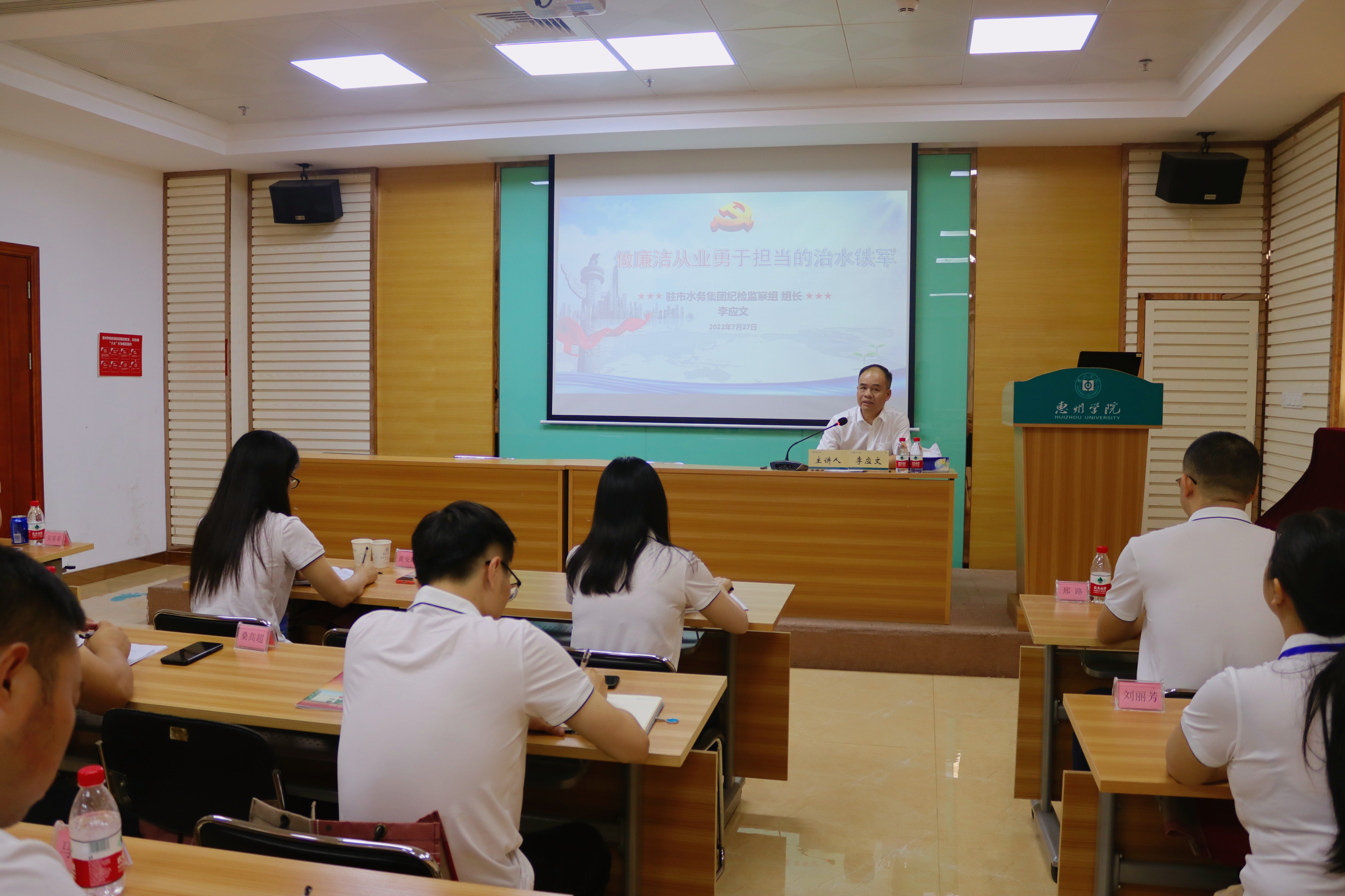 7月26日上午,駐市水務(wù)集團紀(jì)檢監(jiān)察組組長為中青年干部培訓(xùn)班講授以《做廉潔從業(yè)勇于擔(dān)當(dāng)?shù)闹嗡F軍》為題的廉潔黨課。